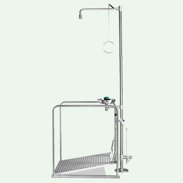- Betätigung der Augendusche über Fußtrittrost aus feuerverzinktem Stahl, Befestigung über Edelstahlseil an Winkelumlenkung, Abmessungen (B x T): 800 x 800 mm
