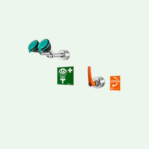 Die richtige Strahlhöhe und ein normgerechtes Strahlbild werden durch den integrierten Mengenregulator unabhängig vom anstehenden Wasserdruck erreicht. Die Gummimuffen um den Brausekopf schützen den Hilfesuchenden vor Stoßverletzungen. Staubabdeckkappen auf dem Brausekopf schützen gegen Verschmutzung und öffnen bei Betätigung der Augendusche durch den Wasserdruck selbständig. Die großen Bohrungen in den Brauseköpfen verhindern stehendes Wasser und somit Verkalkung.