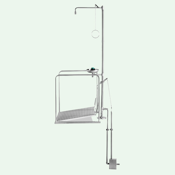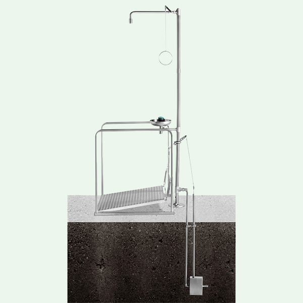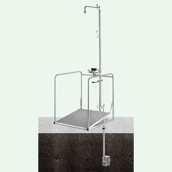 - Betätigung der Augendusche über Fußtrittrost aus feuerverzinktem Stahl, Befestigung über Edelstahlseil an Winkelumlenkung, Abmessungen (B x T): 800 x 800 mm