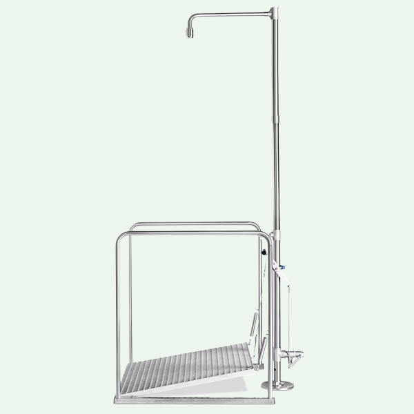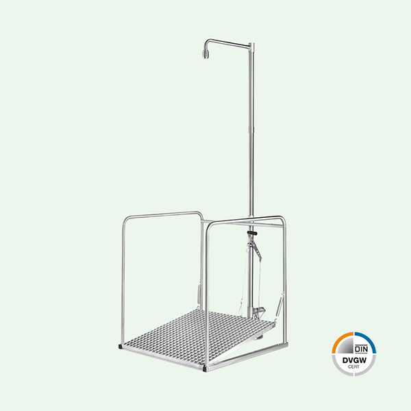 - Betätigung der Notdusche über Fußtrittrost aus feuerverzinktem Stahl, Befestigung über Edelstahlseil an Winkelumlenkung, Abmessungen (B x T): 800 x 800 mm