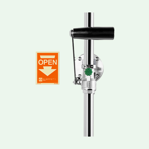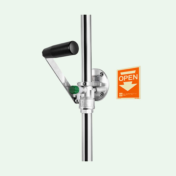 Das Notduschenventil besteht aus einem robusten Kugelhahn mit Trinkwasserzulassung, der wahlweise rechts oder links neben der Tür montiert werden kann. Der Volumenstrom beträgt mindestens 60 Liter / Minute bei 1 bar Fließdruck. Die Betätigung erfolgt durch einen Hebel aus Edelstahl mit einem stabilen Griff aus Kunststoff. Eine Montage in Griffhöhe ist für dieses Notduschenventil empfehlenswert. Über eine optionale Entleerung kann die automatische Entleerung zwischen Duschkopf und Ventil gewährleistet werden.
