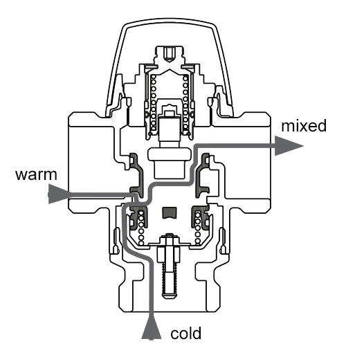 Das Thermostatmischventil gewährleistet auch bei einem Ausfall der Warmwasserzufuhr die kontinuierliche Wasserversorgung (z.B. wenn das Warmwasser abgestellt ist). Die Funktion kommt zum Einsatz, wenn der Differenzdruck zwischen Kalt- und Warmwasser 0,5 bar übersteigt. In diesem Fall tritt an der Abnahmestelle Kaltwasser aus (Bypass-Funktion).